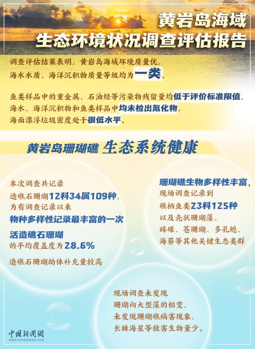 中新网7月12日电 7月10日,由生态环境部华南环境科学研究所、生态环境部国家海洋环境监测中心等5家单位共同编制的《黄岩岛海域生态环境状况调查评估报告》发布。该《报告》显示,黄岩岛海域环境质量优,海水水质、海洋沉积物质量等级均为一类。黄岩岛珊瑚礁生态系统健康,珊瑚礁生物多样性丰富。