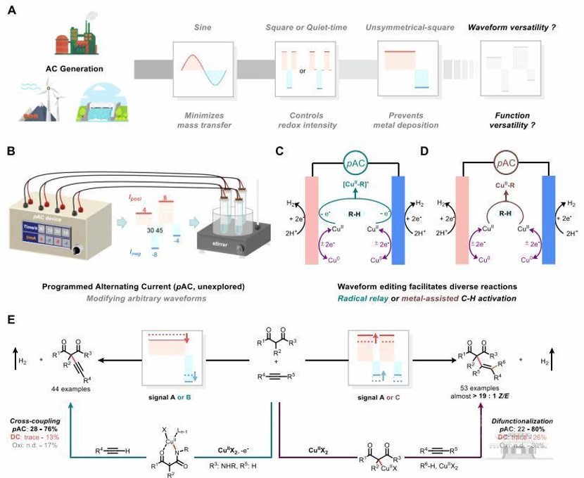 雷爱文介绍,研究团队开发了一种可编程波形交流电合成技术(pAC),通过对交流电的相关电学参数进行程序编辑,可得到定制化的交流电信号,不同编辑模式的交流电信号不仅促进了电解条件下铜催化剂循环再生,还可分别精准调控铜催化剂形成“铜结合碳自由基物种”和“碳-铜活性物种”。研究团队还观测到不同交流电信号动态调控铜催化物种活性的变化规律。