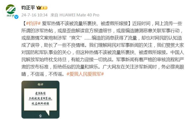 近段时间,网上流传一些所谓的涉军热帖,或是歪曲解读官方报道细节,或是编造臆测恶意关联军事行动,或是激情文案炮制涉军“爽文”……编造的消息获得了流量,却也对网民的认知造成了误导,助长了一些不良情绪。我们理解网民对军事新闻的关注,我们赞赏大家对国防和军队事业的关心,但这种热情不该被流量所裹挟、被虚假所嫁接。中国人民解放军始终枕戈待旦,有能力迎接一切挑战。军事新闻有着严格的审核流程和严肃的发布标准,拒绝低俗的流量和娱乐。广大网友在关注涉军新闻时,务必擦亮眼睛,不信谣,不传谣。