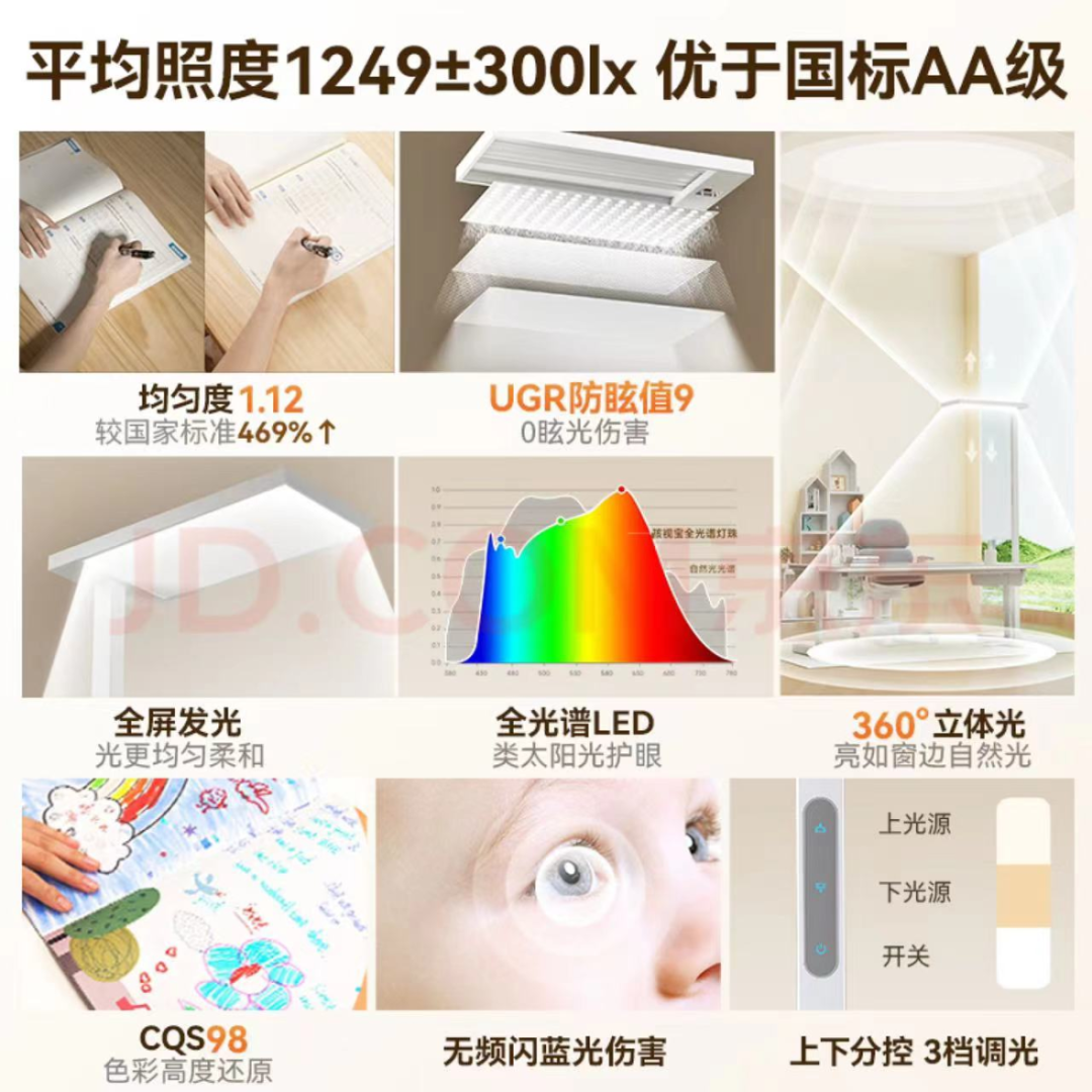 有的宣称“教育照明领导者好光无忧”“行业首创非对称出光角,漫反射更充分,全屋均匀不累眼”;