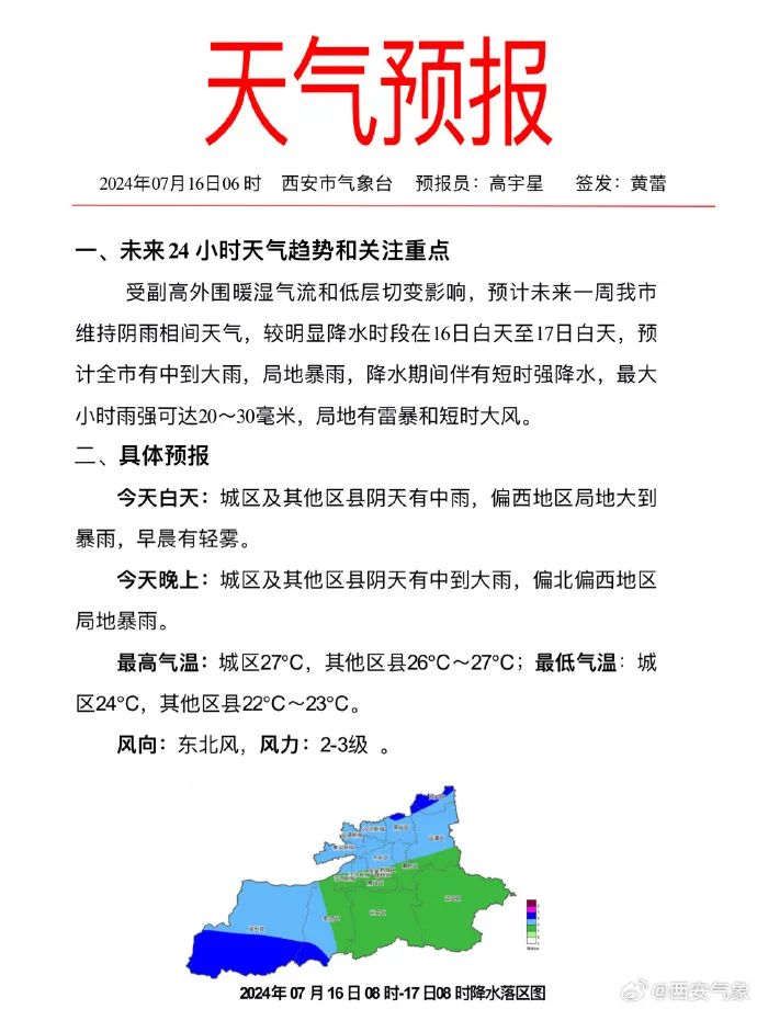 西安市气象台2024年07月16日09时50分发布暴雨蓝色预警:受副高外围暖湿气流和低层切变影响,预计7月16日13时至17日13时西安全市有大雨(30~50毫米),阎良区、临潼区、长安区、高陵区、鄠邑区、周至县、蓝田县、西咸新区的部分地方有暴雨(50~80毫米,局地可达90~110毫米)。主要降水时段在今天傍晚至明天上午,降水期间伴有短时强降水(最大小时雨强20~30毫米)、局地有雷暴及短时大风。强降水影响区域易出现城乡积涝、山洪、中小河流洪水及滑坡、泥石流、崩塌等地质灾害,请做好应急准备工作,同时需密切关注最新预报预警信息,适时采取应急措施。