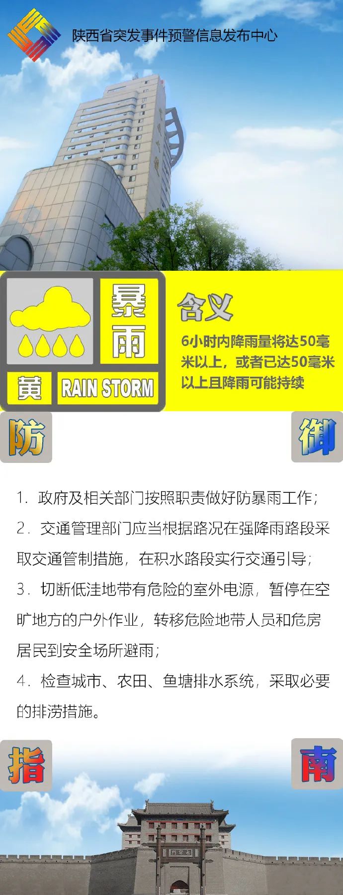 陕西省气象台2024年07月16日12时03分发布暴雨黄色预警信号:目前汉中市西部县区降水量已达50毫米以上且降雨可能持续,预计下述地区未来6小时内降雨量将达50毫米以上:西安市临潼区、长安区、鄠邑区、蓝田县、周至县,宝鸡市陈仓区、扶风县、眉县、岐山县、凤翔区、太白县、麟游县,咸阳市秦都区、兴平市、武功县、三原县、泾阳县、礼泉县、乾县、永寿县、淳化县,铜川市印台区、宜君县,渭南市临渭区、华阴市、华州区、潼关县、大荔县、蒲城县、富平县、白水县,延安市黄龙县、洛川县,汉中市佛坪县,安康市宁陕县,商洛市商州区、洛南县、丹凤县、商南县、山阳县、柞水县,杨凌示范区杨陵区,局地伴有短时暴雨或雷暴大风,小时雨量可达30mm以上。上述地区境内发生山洪、泥石流等灾害风险较高,请注意防范。