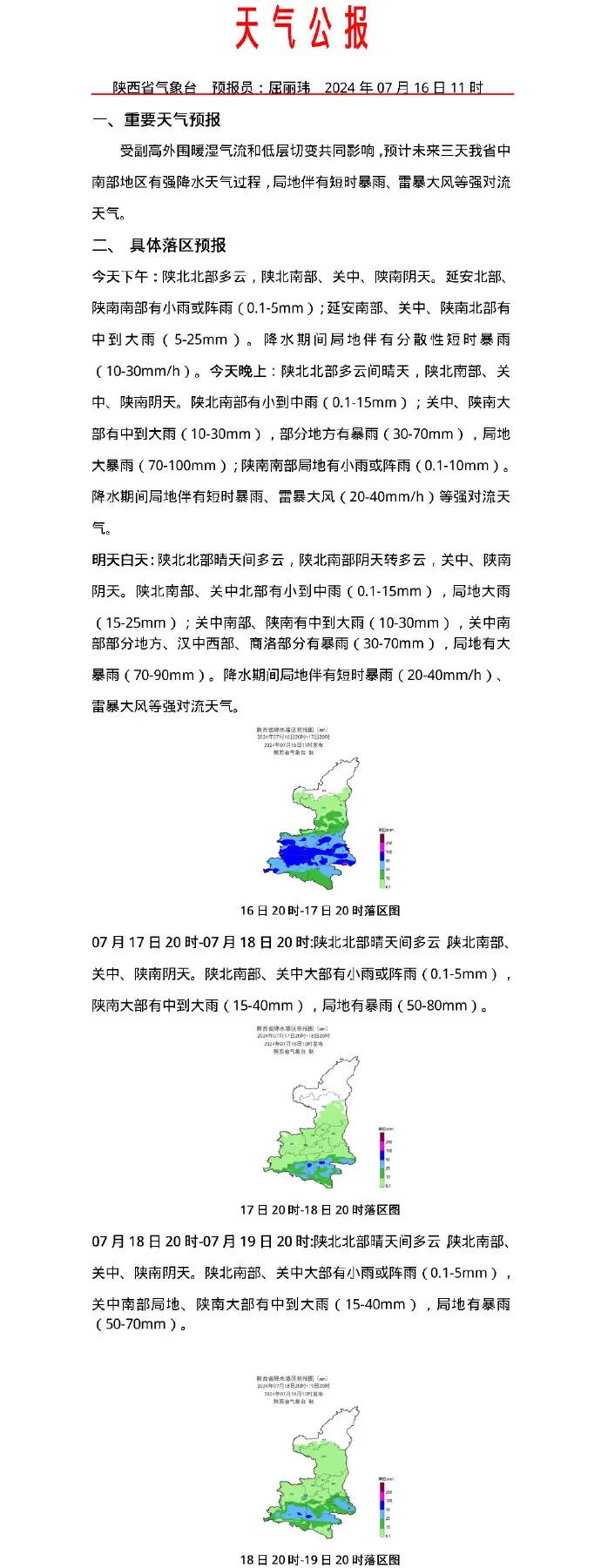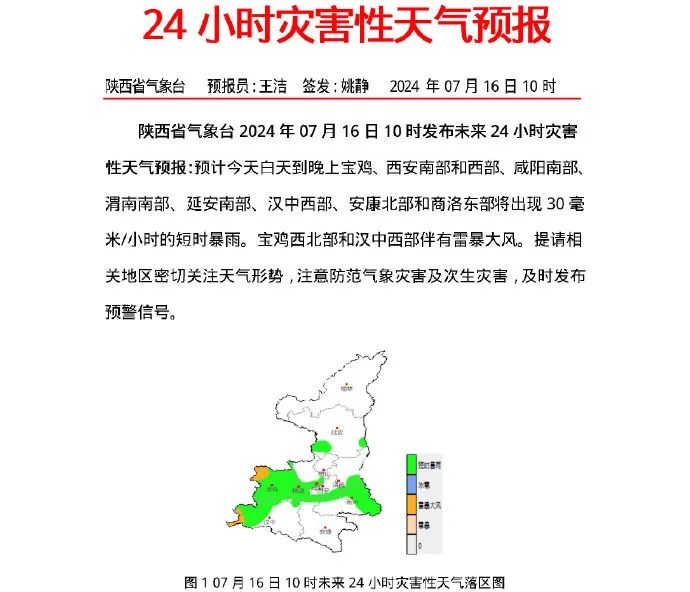 陕西省气象台2024年07月16日10时发布未来24小时灾害性天气预报:预计今天白天到晚上宝鸡、西安南部和西部、咸阳南部、渭南南部、延安南部、汉中西部、安康北部和商洛东部将出现30毫米/小时的短时暴雨。宝鸡西北部和汉中西部伴有雷暴大风。提请相关地区密切关注天气形势,注意防范气象灾害及次生灾害,及时发布预警信号。