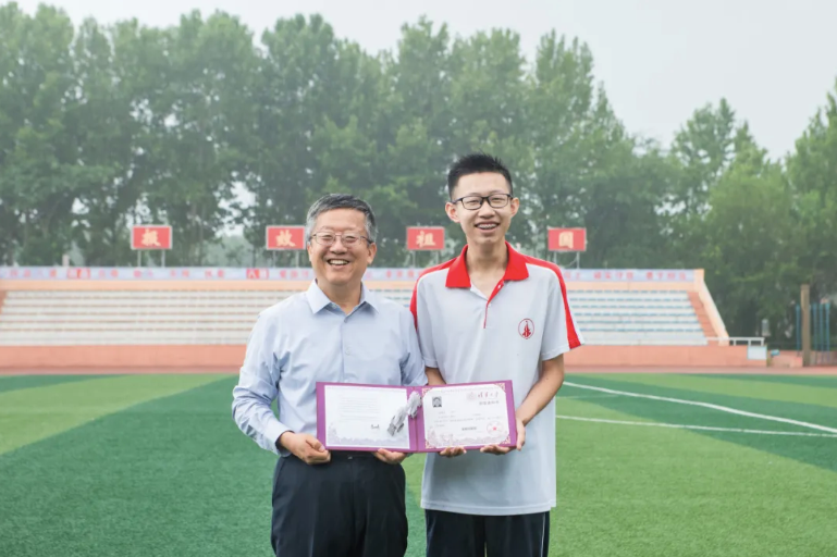 清华笃实书院院长张雄教授(左)为武邑中学吕昊天(右)颁发录取通知书。