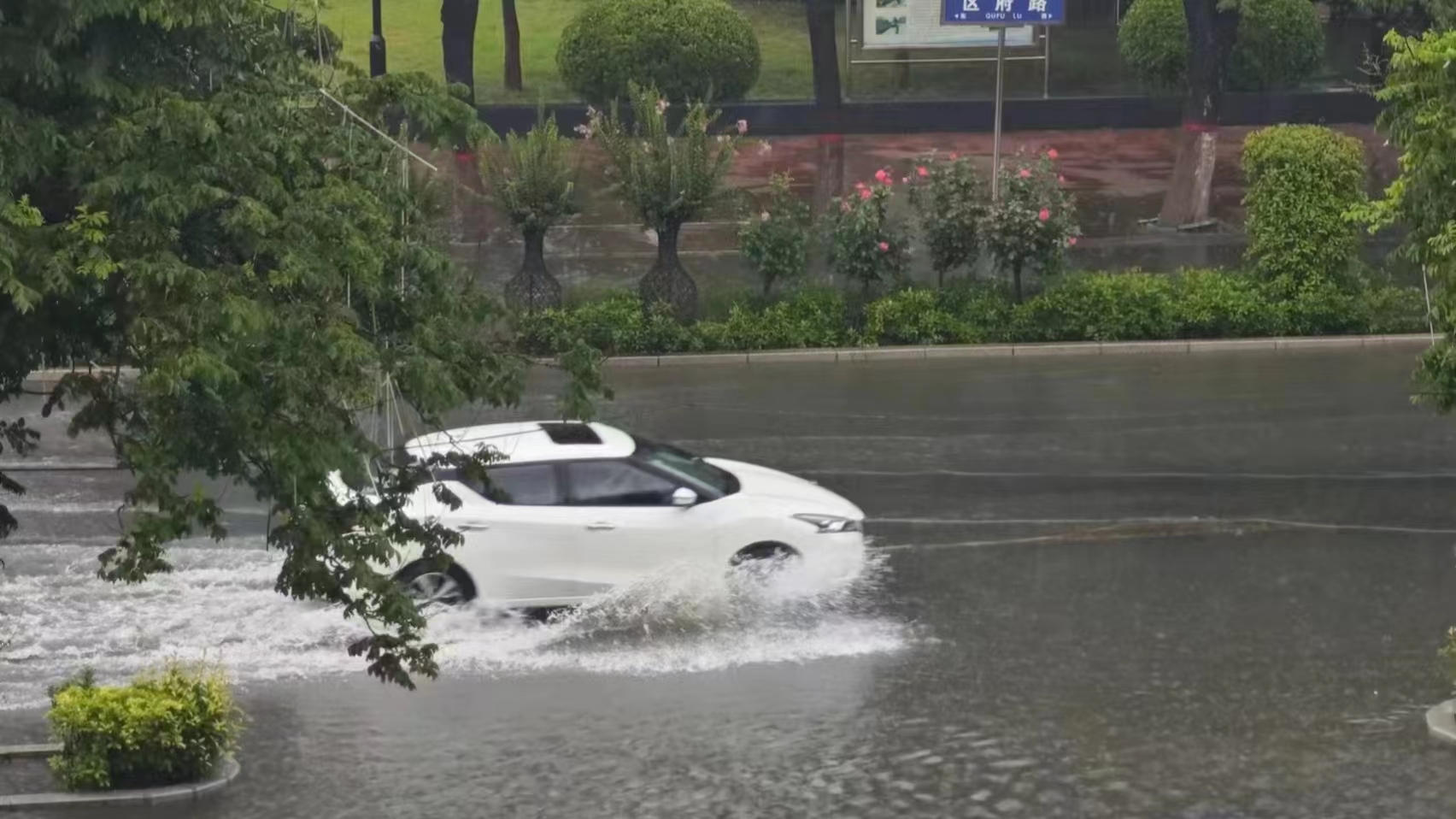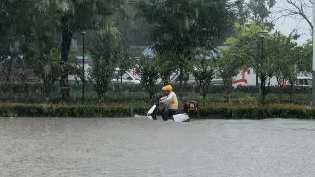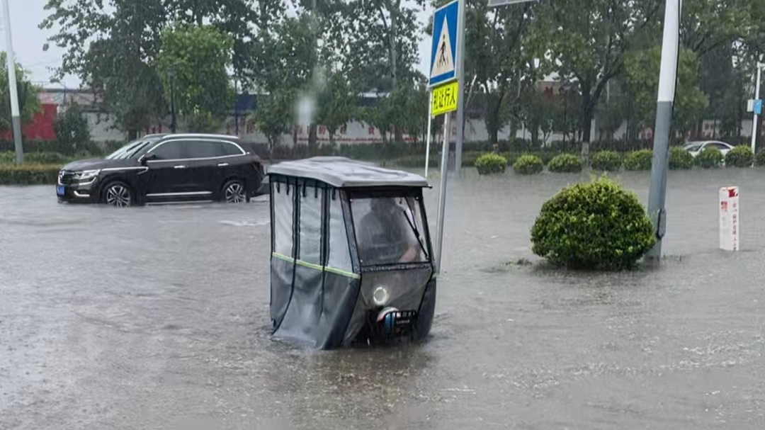大象新闻记者了解到,新乡市市区内已经出现大面积积水,其中城市东北地区较为严重。家住牧野区的张先生表示,“路面积水高度已经达到50-60厘米,大约到膝盖位置,更深一点的积水已经达到80厘米”。