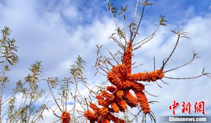 一颗颗沙棘果在阳光的照耀下闪耀着光芒。