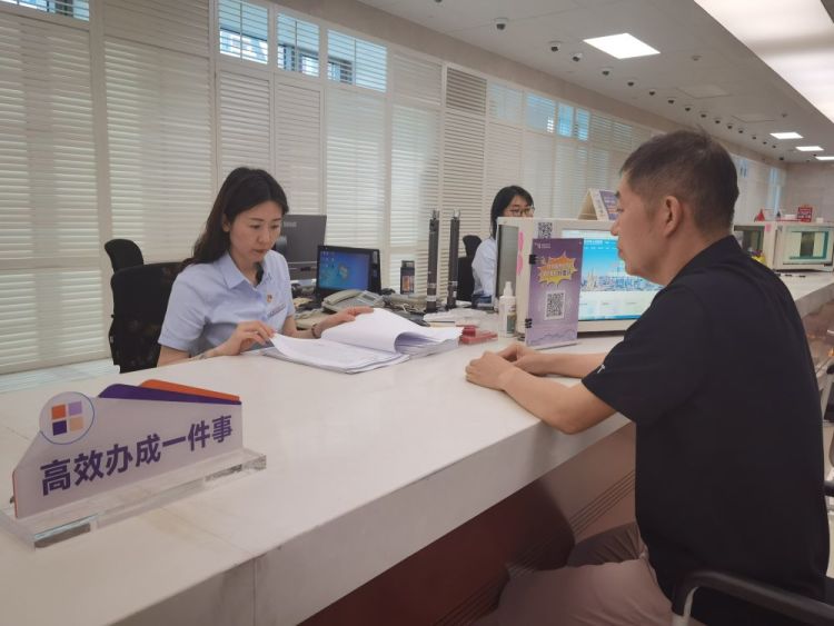 7月17日,在天津滨海新区政务服务中心“高效办成一件事”专区,企业负责人正在提交申请材料。新华社记者杨文 摄