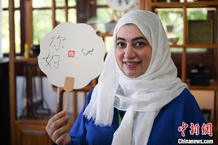 7月19日,金砖国家青年诗人展示扇面上的自制章印,以及书写的汉语、阿拉伯语“你好”。中新社记者 王刚 摄