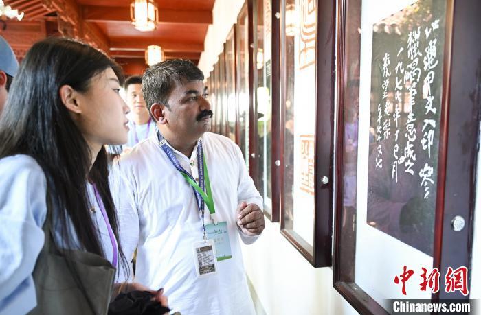 7月19日,金砖国家青年诗人(右)参观西泠印社。中新社记者 王刚 摄