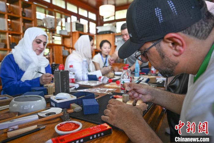 7月19日,金砖国家青年诗人在西泠印社体验印章制作。中新社记者 王刚 摄