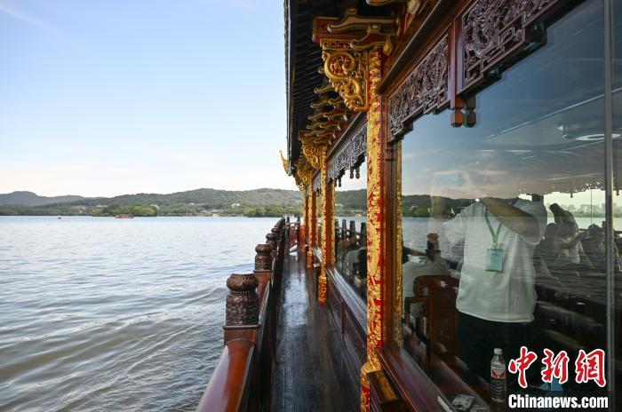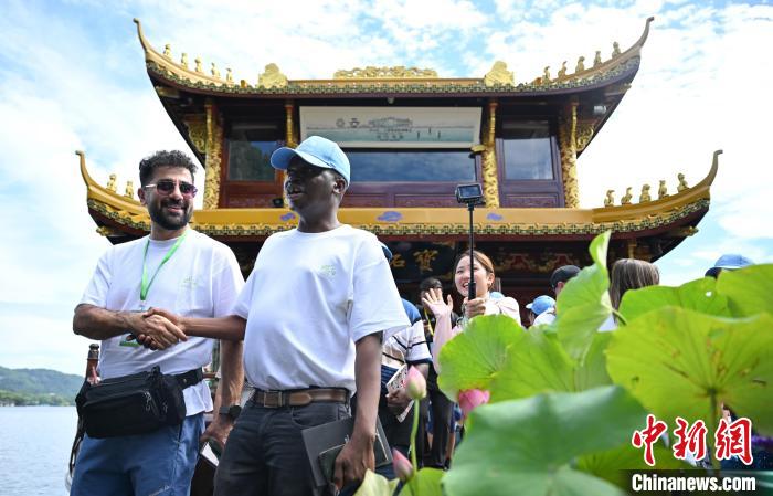 7月19日,金砖国家青年诗人乘船游览西湖。中新社记者 王刚 摄
