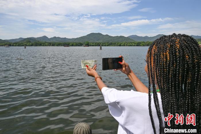 7月19日,金砖国家青年诗人同框拍摄西湖三潭印月和一元人民币。中新社记者 王刚 摄