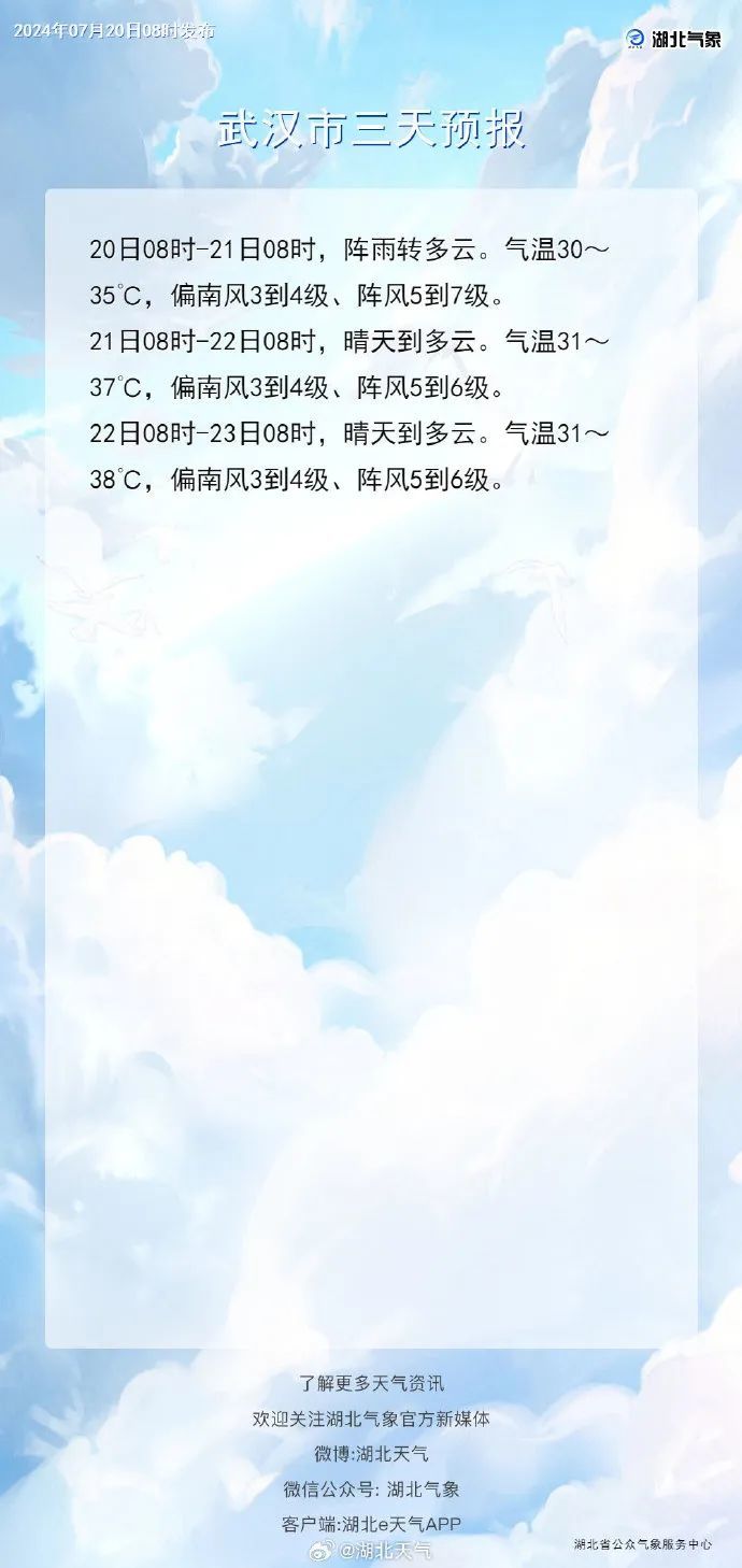 武汉中心气象台2024年07月20日07时03分发布高温黄色预警:预计今天白天,十堰南部、襄阳西部、宜昌大部、荆门南部、荆州、潜江、仙桃、武汉南部、黄冈南部、黄石、咸宁等地最高气温将升至35℃以上,局地超过37℃,请注意防范。