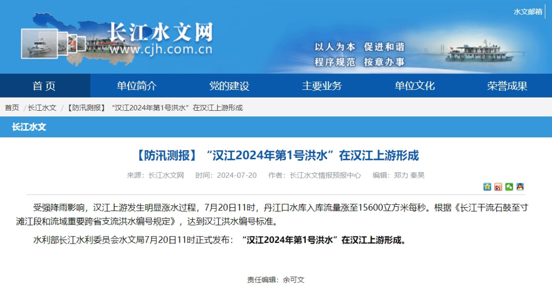 水利部长江水利委员会水文局7月20日11时正式发布:“汉江2024年第1号洪水”在汉江上游形成。