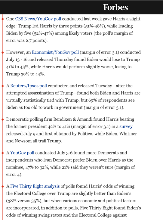最后,根据美国福布斯网站的报道,多家美国民调机构截至目前的民调结果显示,哈里斯赢得11月总统选举的机会,同样低于特朗普。其中一些民调显示,她比拜登的几率稍微好一些,也有更多民调认为,眼下她的胜率还不如拜登。