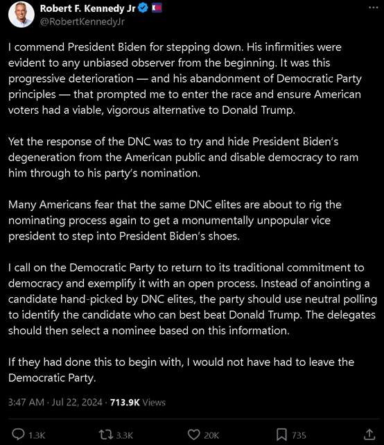 目前在民调上有8%左右支持率、可能会成为今年美国总统选举搅局者的独立参选人小肯尼迪,也呼吁民主党通过公开透明的程序选择出可以战胜特朗普的最佳人选,而不是让少数精英决定谁上谁下。