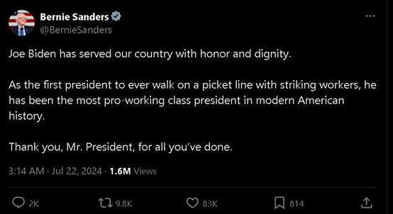美国知名左翼政治人物桑德斯也称赞了拜登,并感谢了拜登的付出。
