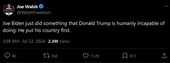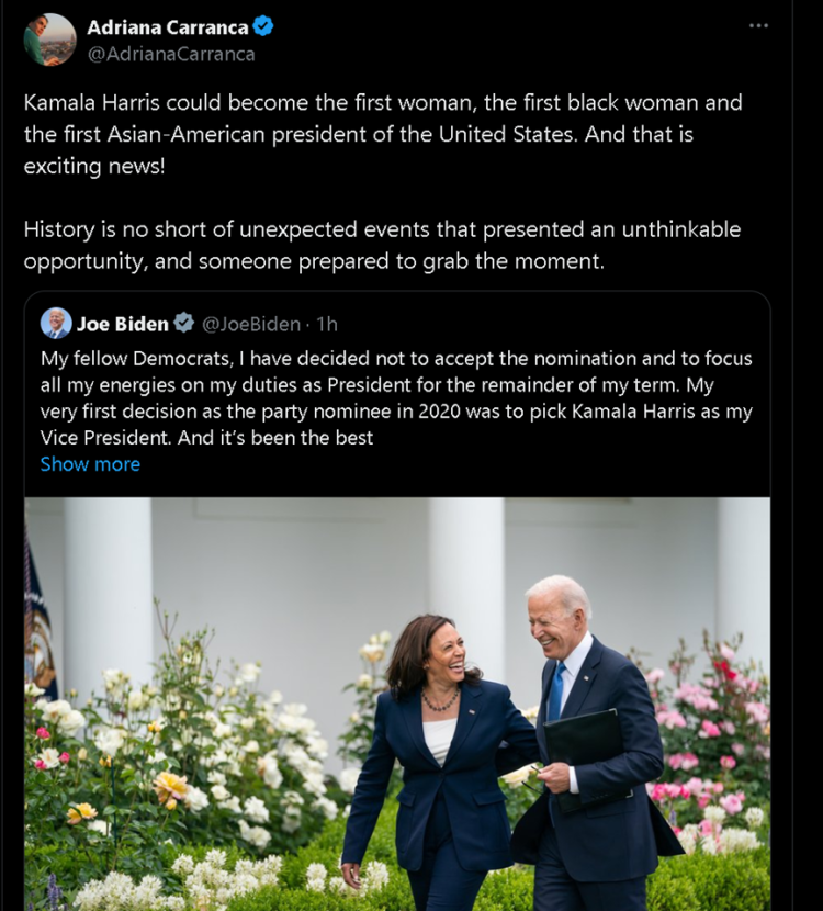 目前,从多家美国媒体的报道来看,拜登这个“让位”于哈里斯的举动,已经得到了民主党内部从克林顿到奥巴马这些资深大佬级人物的支持,民主党在国会众议院和参议院的领袖也都称赞了拜登的举动。有认可拜登的美国政治人物更表示,拜登此举说明了他把国家的利益放在了个人利益前面。