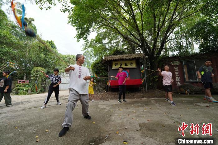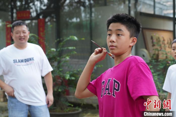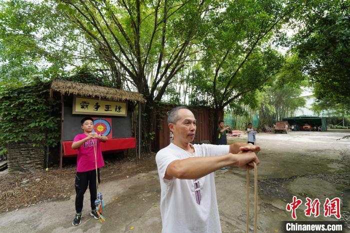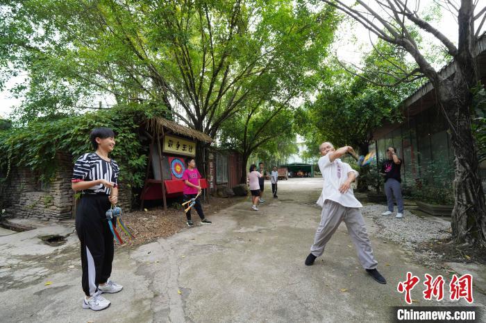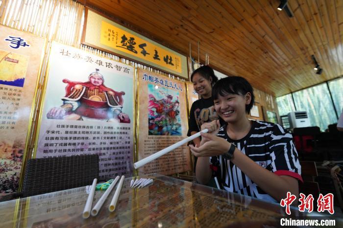 7月21日,几位初中毕业生在广西南宁市老木棉·匠园景区内,跟随壮族飞镖、壮族飞陀技艺代表性传承人农俊宁学习体验飞镖、飞陀等非遗项目,并学习广西“俍兵”征战南北的故事。农俊宁被称为“壮族镖王”,多次在国际、国内赛事上斩获冠军。近年来,借助非遗研学热潮,广西各项非遗获得更大的客群与名气。王以照 摄