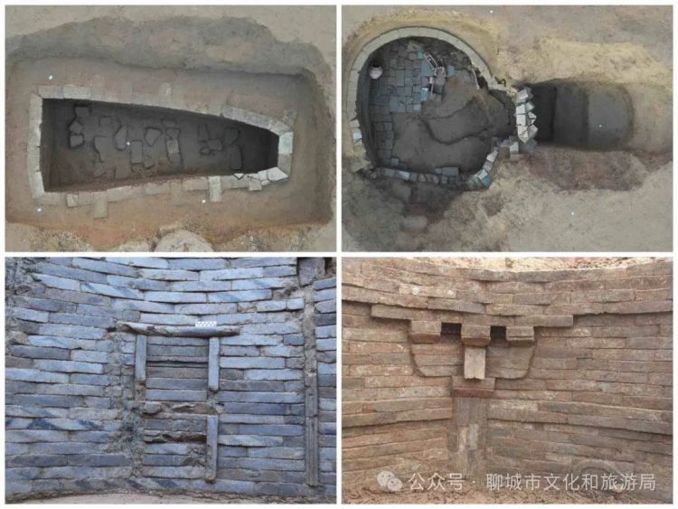 该考古发掘项目由山东省文物考古研究院负责实施,考古队伍于6月26日进场发掘,截至目前,共清理古墓葬4座。发掘的古墓葬位于距地表约6米深的基坑底部,均为砖室墓,其中3座为圆形墓,1座为舟形墓,圆形墓为仿木结构砖雕墓,墓壁装饰有斗拱、直棂窗、桌椅等砖雕。出土器物有盘、碗、执壶、罐、铜钱、墓志砖等十余件(套)。根据墓葬形制、出土器物的时代特征,初步判断本次发掘的墓葬时代为唐代,应为家族墓地,具有较高的文物价值,尤其是唐代墓葬发现仿木结构砖雕,在聊城市尚属首次,对研究聊城的历史文化有着较高的价值。