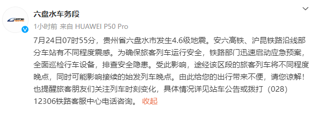 据@六盘水车务段 消息,地震发生后,安六高铁、沪昆铁路沿线部分车站有不同程度震感。为确保旅客列车运行安全,铁路部门迅速启动应急预案,全面巡检行车设备,排查安全隐患。受此影响,途经该区段的旅客列车将不同程度晚点,同时可能影响接续的始发列车晚点。