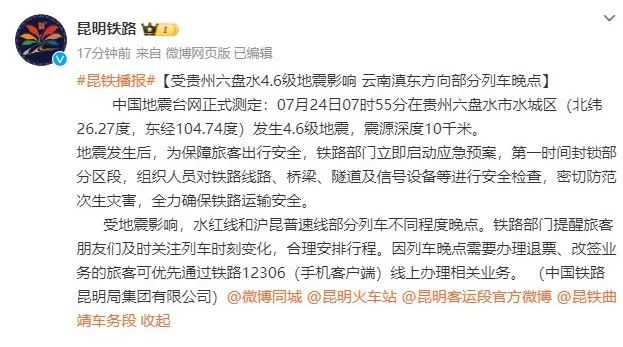 (来源:贵州省地震局、六盘水日报、@六盘水车务段、@昆明铁路)