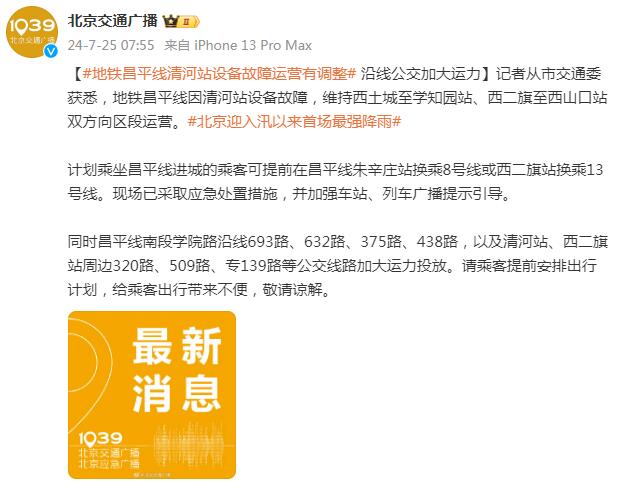 计划乘坐昌平线进城的乘客可提前在昌平线朱辛庄站换乘8号线或西二旗站换乘13号线。现场已采取应急处置措施,并加强车站、列车广播提示引导。