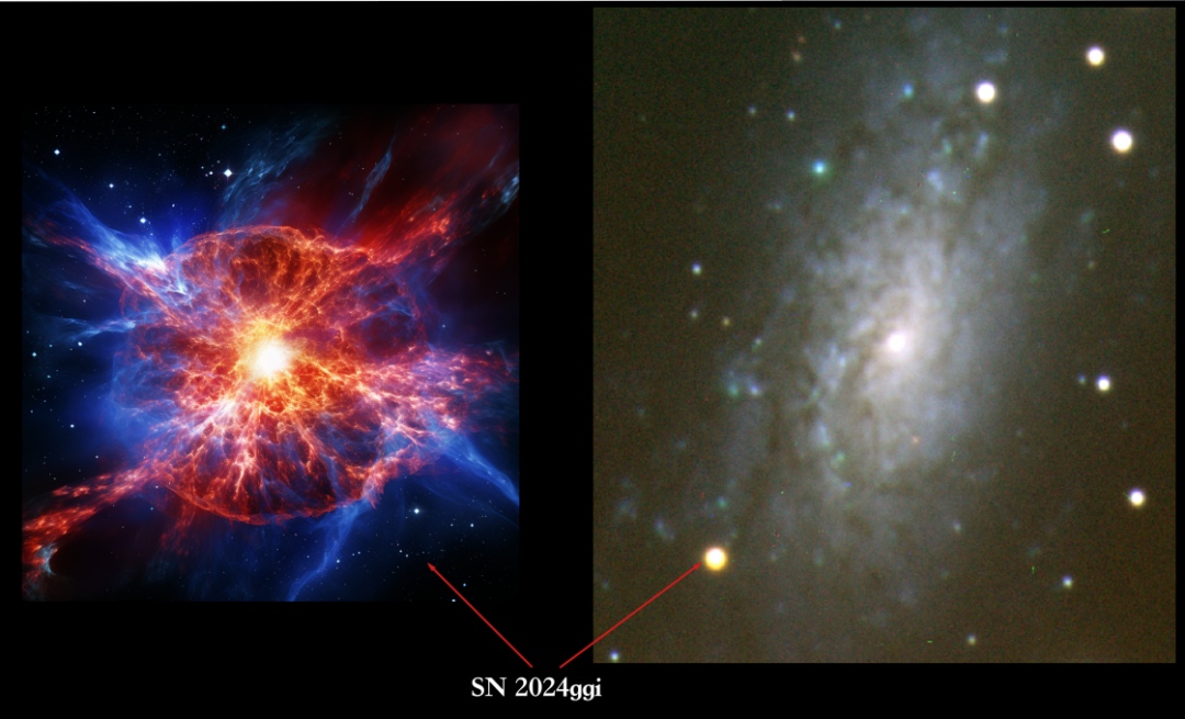 图左为超新星SN 2024ggi激波突破艺术想象图;图右为该星和宿主星系的实测图。云南天文台供图