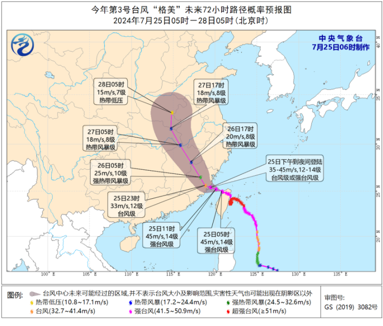 7月25日8时至26日8时,黄海南部、东海大部、巴士海峡、南海大部、华东和华南沿海、长江口区、杭州湾将有7-8级大风,其中东海南部及钓鱼岛附近海域、台湾海峡、台湾以东洋面、台湾岛沿海、福建沿海、浙江东南部沿海的风力有9-12级,“格美”中心经过的附近海面或地区的风力有13-14级,阵风15-16级。