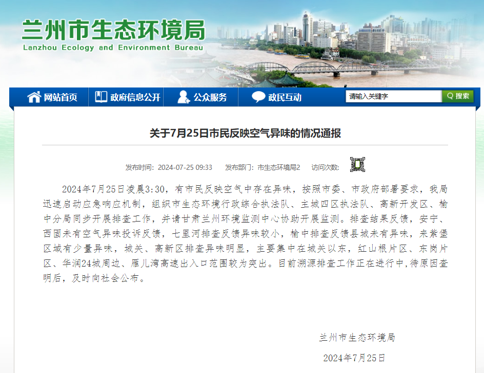 2024年7月25日凌晨3:30,有市民反映空气中存在异味,按照市委、市政府部署要求,我局迅速启动应急响应机制,组织市生态环境行政综合执法队、主城四区执法队、高新开发区、榆中分局同步开展排查工作,并请甘肃兰州环境监测中心协助开展监测。排查结果反馈,安宁、西固未有空气异味投诉反馈,七里河排查反馈异味较小,榆中排查反馈县城未有异味,来紫堡区域有少量异味,城关、高新区排查异味明显,主要集中在城关以东,红山根片区、东岗片区、华润24城周边、雁儿湾高速出入口范围较为突出。目前溯源排查工作正在进行中,待原因查明后,及时向社会公布。