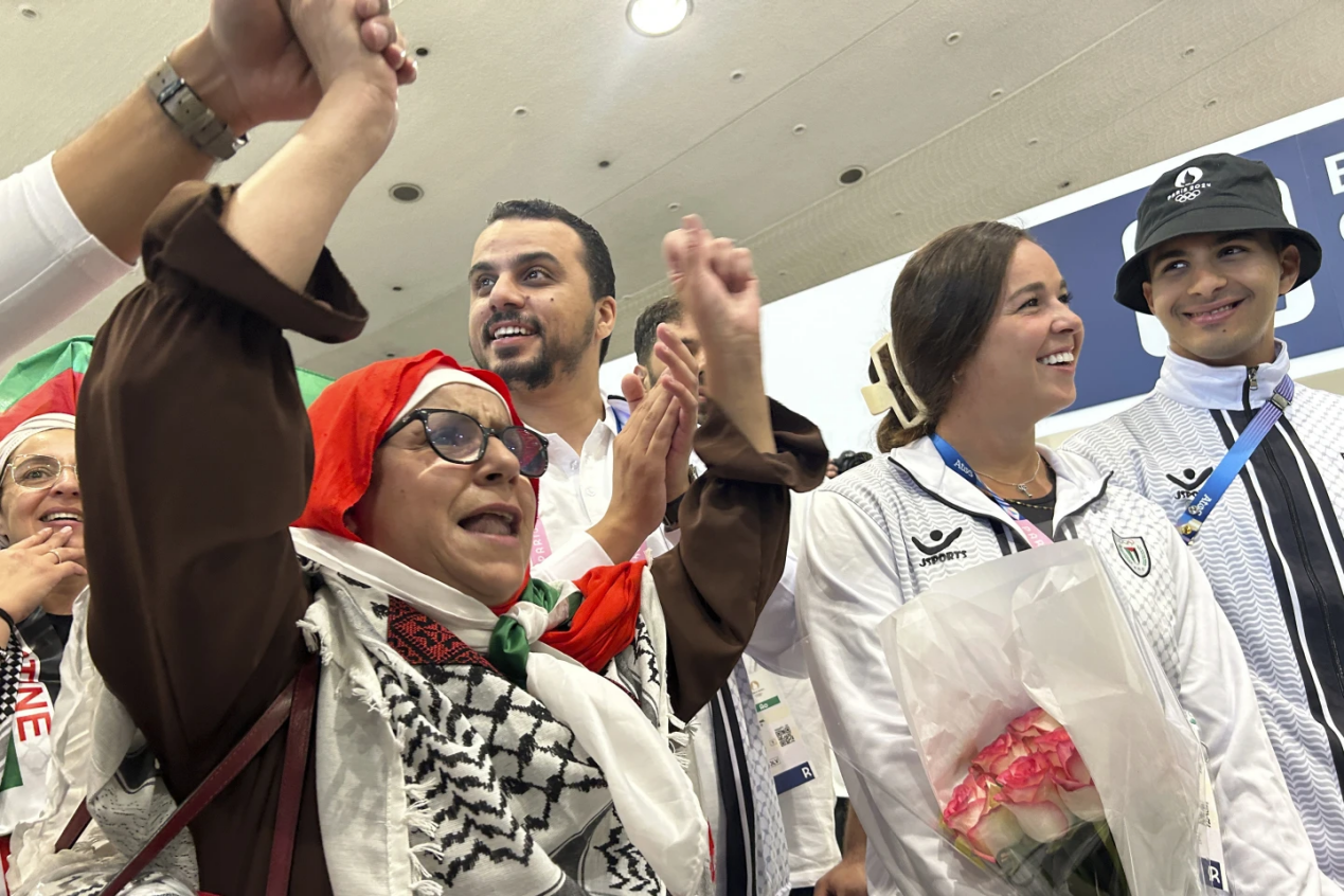 报道称,迎接他们的人群由运动员、法国支持者和政界人士组成,他们呼吁欧洲国家承认巴勒斯坦国,并对允许以色列参加巴黎奥运会表示不满。