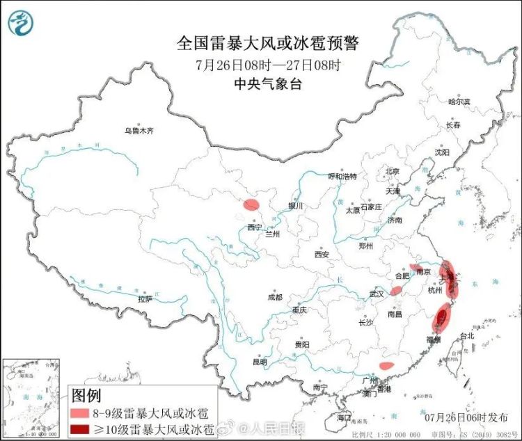 预计7月26日08时至27日08时,甘肃中西部、安徽中部、江苏东南部、上海、浙江东部、福建东北部、广东中东部等地的部分地区将有8级以上雷暴大风或冰雹天气,其中,浙江东部和福建东北部等地的部分地区将有10级以上雷暴大风,最大风力可达10级以上。