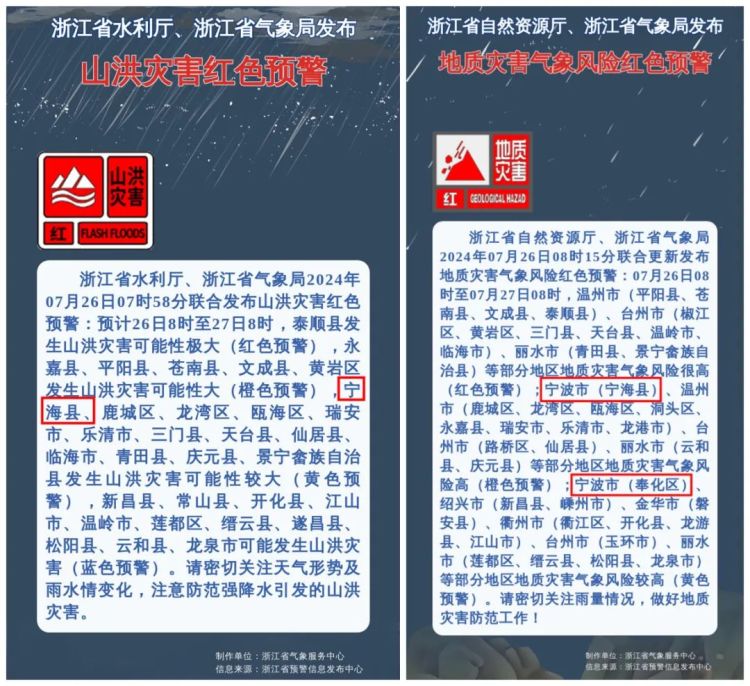 浙江省自然资源厅、浙江省气象局发布地质灾害气象风险红色预警[Ⅰ级/特别严重]和山洪灾害红色预警[Ⅰ级/特别严重]