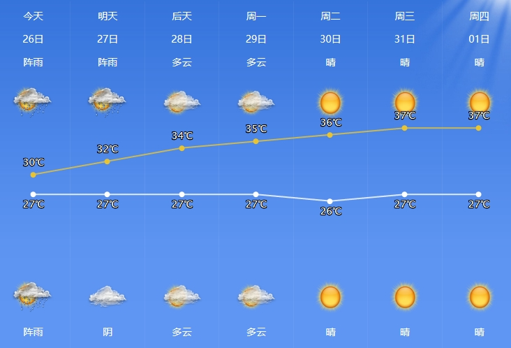 明天起风雨就会逐渐减弱,届时副热带高压会再次强盛起来,高温又将反扑。29日起,最高气温将回到35℃以上。请市民及时关注最新天气动态。防暑工作不能放松,届时也不时有午后雷雨打扰。