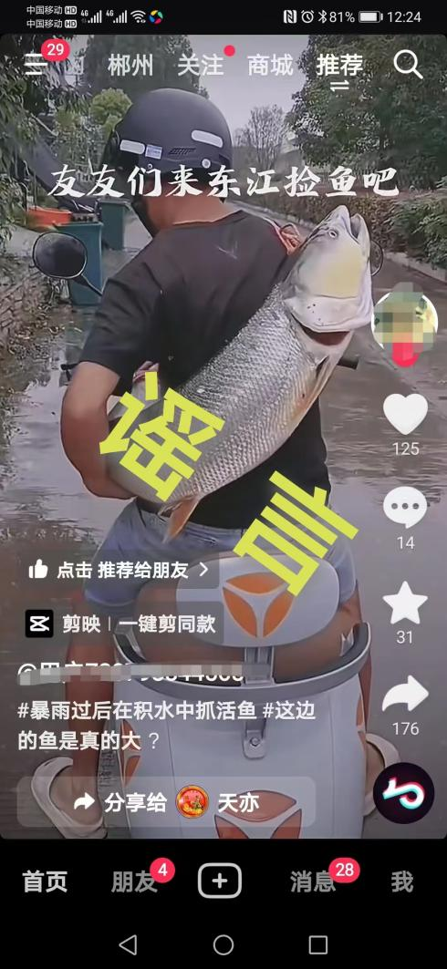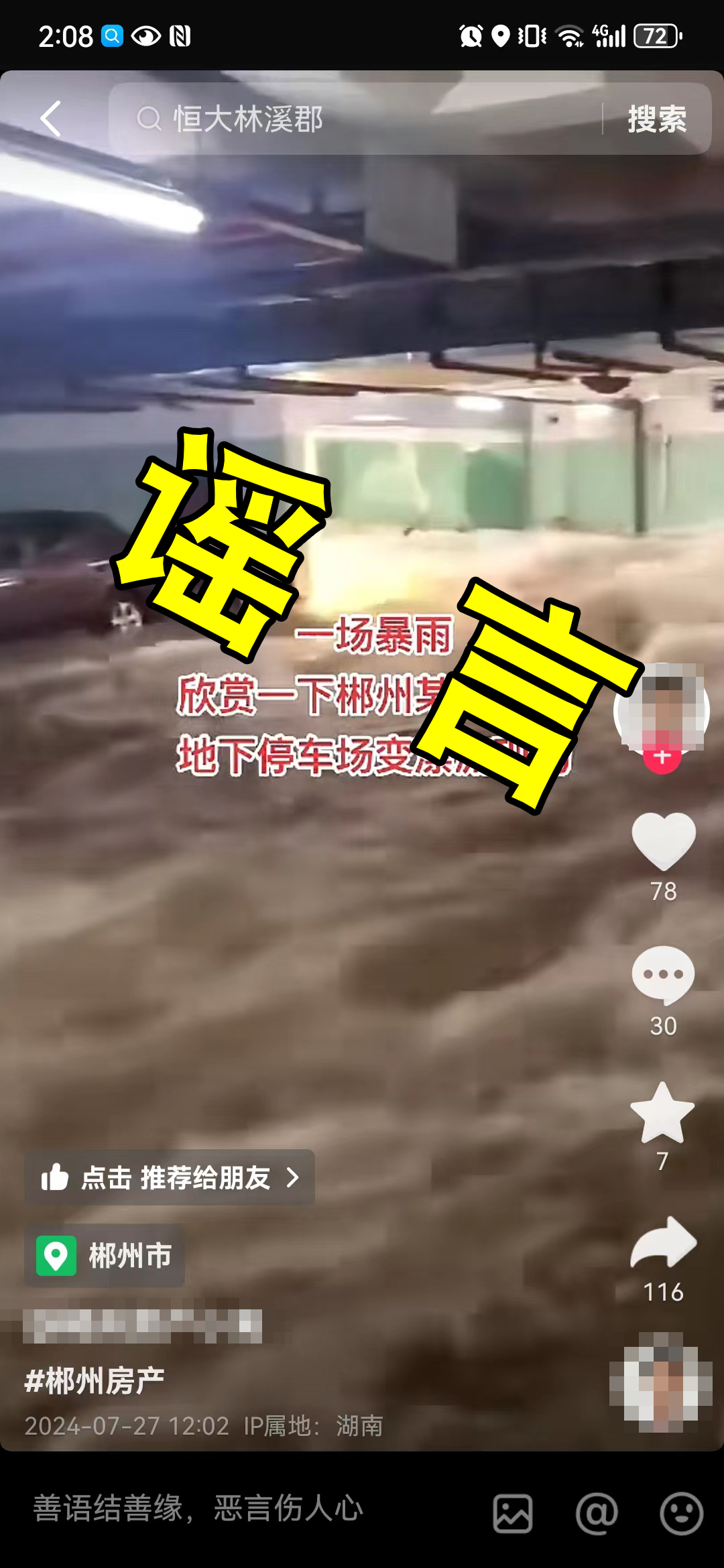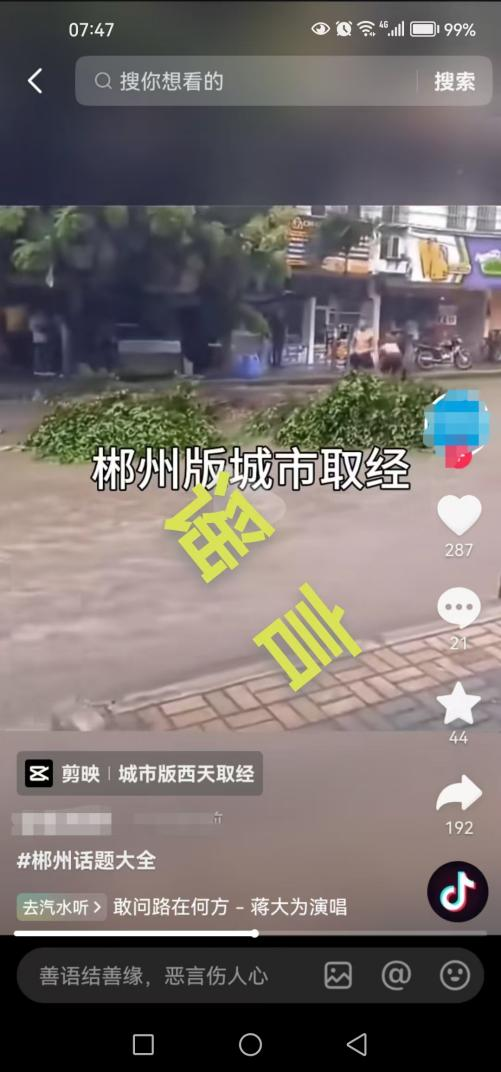 7月28日,郴州市委网信办巡查发现某短视频平台传播两段视频,一段是城市街道被洪水淹没并配文“郴州版城市取经”的视频;另一段是暴雨过后在积水中抓鱼并配文“友友们来东江捡鱼吧”的视频。经核实,相关视频系网民恶意拼凑,郴州并未出现视频所述情况。网信部门已将谣言线索移交公安部门依法处置。