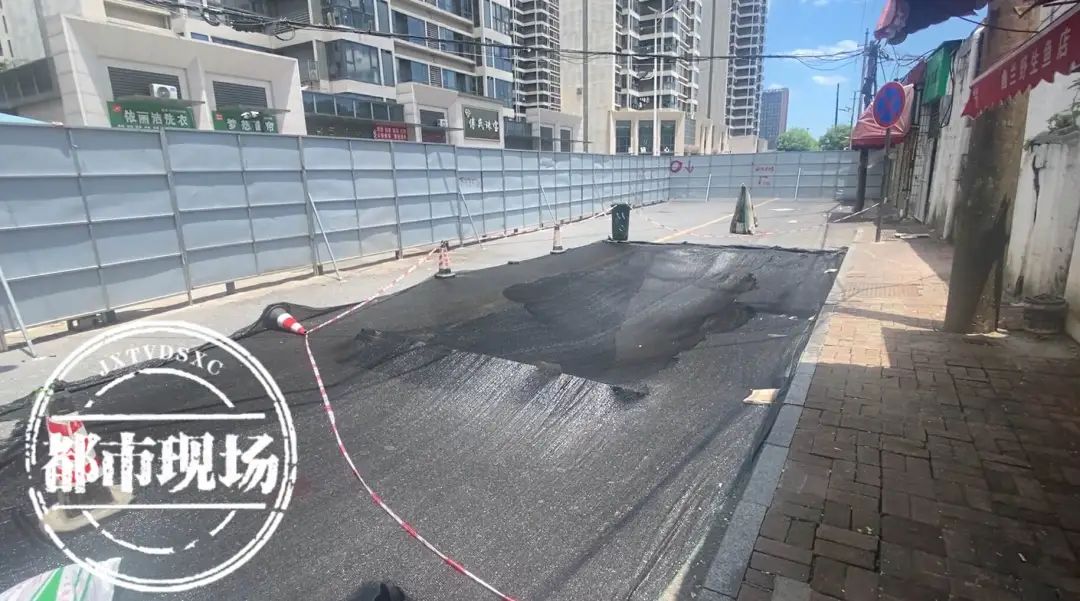 29日中午12点钟左右,都市现场记者在事发现场看到,塌陷的路面已被围挡,据附近店主介绍,塌陷发生在28日晚上11点左右。