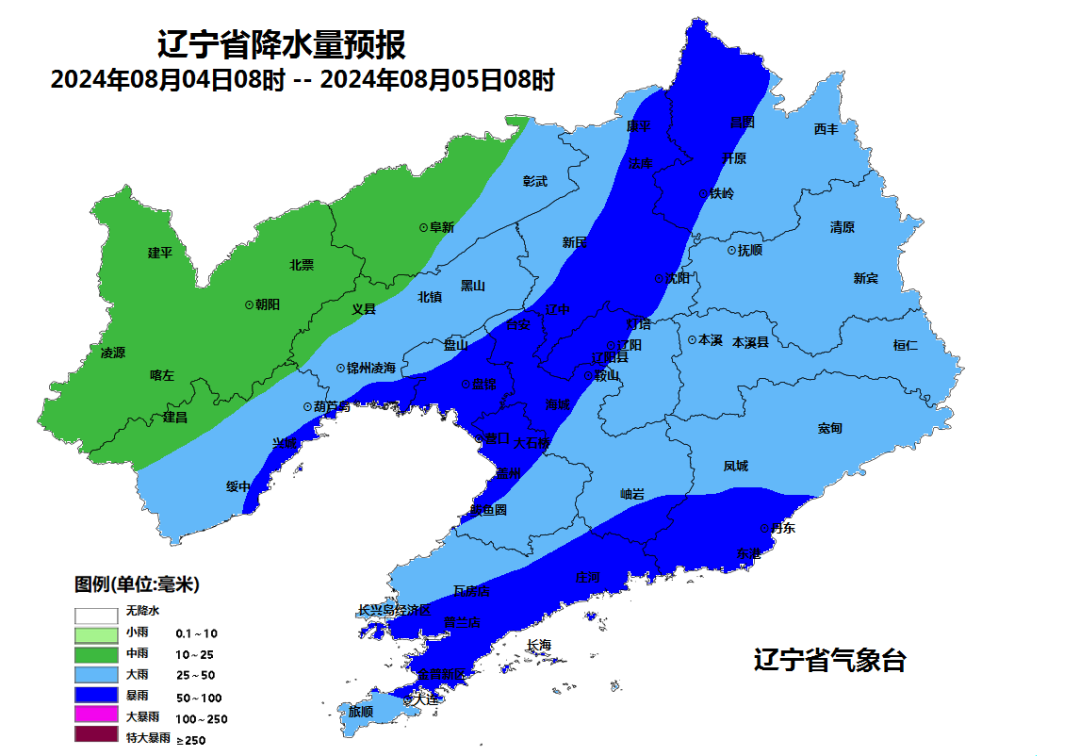 辽宁省气象台预报,受副高外围水汽和高空槽的影响,8月4日至5日白天我省中北部和东南部地区有暴雨,局部大暴雨,并伴有短时强降水、雷暴大风等强对流天气。主要降雨时段为4日白天至夜间。