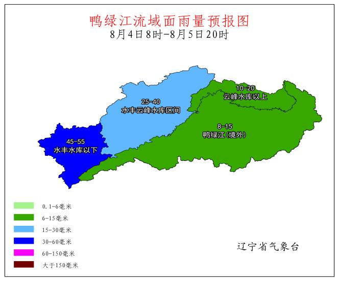 鸭绿江流域:鸭绿江流域云峰水库以上面雨量为10~20毫米;鸭绿江流域水丰云峰水库区间为25~40毫米;鸭绿江流域水丰水库以下为45~55毫米;鸭绿江流域境外为8~15毫米。