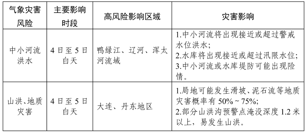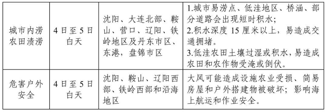 预计4日至5日白天,我省中北部和东南部地区有城市内涝和农田渍涝高风险;鸭绿江、辽河、浑太河流域的部分中小河流有出现超警戒或保证水位洪水的高风险;东南部地区局地有山洪、地质灾害高风险;中北部和东南部地区局部有大风灾害高风险。