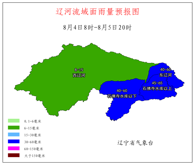 辽河流域:东辽河流域面雨量为40~60毫米;西辽河流域为8~15毫米;辽河干流石佛寺水库以上为45~65毫米,辽河干流石佛寺水库以下为40~60毫米。