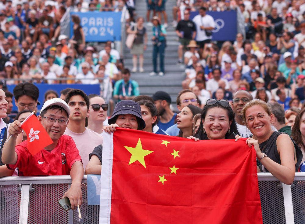 ↑7月30日,观众在巴黎奥运会乒乓球混双决赛现场加油助威。