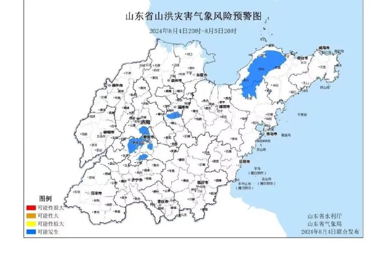 预计8月4日20时至8月5日20时,济南、泰安、淄博、青岛、烟台等市局部地区可能发生山洪灾害(蓝色预警) 。蓝色预警区域包括:历城区南部、肥城市大部、岱岳区西部及东南部、泰山区北部及南部局地、宁阳县中东部、淄川区北部、平度市东北部、莱西市西北部局地 、莱州市东部、招远市大部、龙口市东部及南部、蓬莱区南部、福山区西部、栖霞市西部及北部、莱阳市西部局地。其他地区也可能因局地短历时强降水引发山洪灾害,请各地注意做好实时监测、防汛预警和转移避险等防范工作。