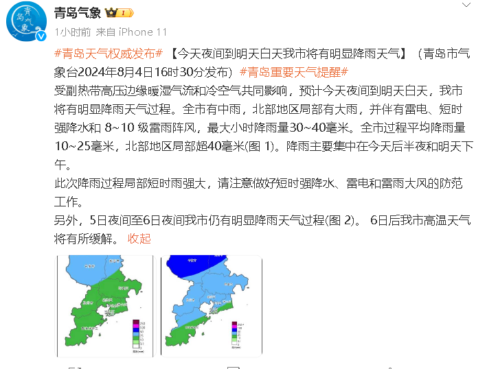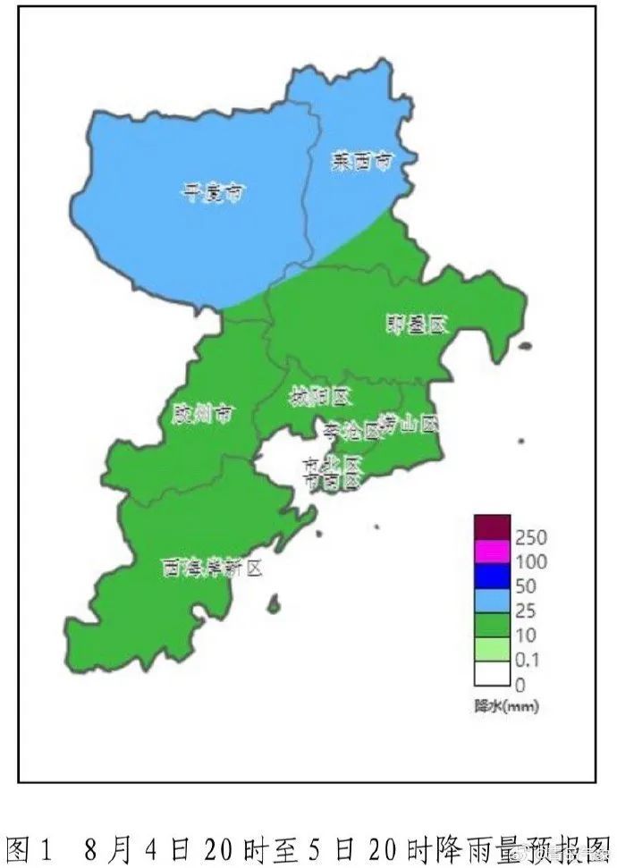 【今天夜间到明天白天我市将有明显降雨天气】(青岛市气象台2024年8月4日16时30分发布)受副热带高压边缘暖湿气流和冷空气共同影响,预计今天夜间到明天白天,我市将有明显降雨天气过程。全市有中雨,北部地区局部有大雨,并伴有雷电、短时强降水和 8~10 级雷雨阵风,最大小时降雨量30~40毫米。全市过程平均降雨量10~25毫米,北部地区局部超40毫米(图 1)。降雨主要集中在今天后半夜和明天下午。