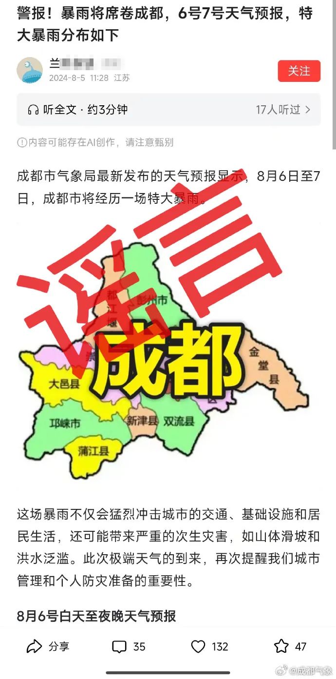 8月5日,一篇题为《警报!暴雨将席卷成都,6号7号天气预报,特大暴雨分布如下》帖文提及“成都市气象局最新发布的天气预报显示,8月6日至7日,成都市将经历一场特大暴雨”,文章配图还引用中央气象台“中长期天气预报8月4-13日(共10天)的累计降雨量图”并歪曲配图原意。
