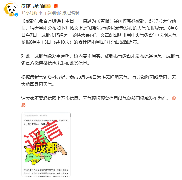 对此,成都市气象台官方微博当日发布辟谣信息称,该内容不属实。成都市气象台未发布此类信息,成都气象官方微博微信也未发布此类信息。