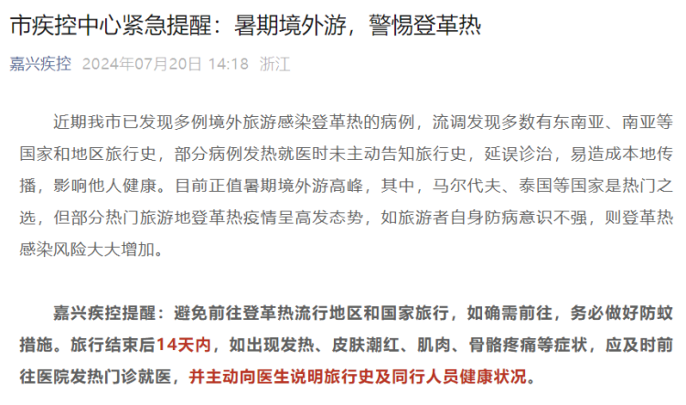 对此,嘉兴市疾控中心日前发布紧急提醒:暑期境外游,警惕登革热。