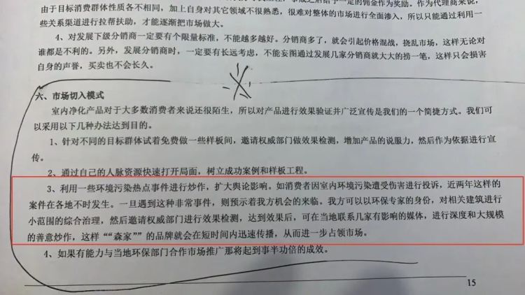 记者获取的森家一份内部培训资料在介绍市场切入模式时提到:“要利用一些环境污染热点事件进行炒作,扩大舆论影响。如消费者因室内环境污染遭受伤害进行投诉,一旦遇到这种非常事件,则预示着我方机会的来临。我方可以以环保专家的身份,对相关建筑进行小范围综合治理,然后邀请权威部门检测,联系当地有影响的媒体,进行深度和大规模炒作……”