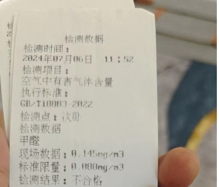 杜兰回忆,2023年春节前,她通过某短视频平台浏览到森家环保官方账号的带货直播,便在网上下了订单。2024年1月13日,森家环保把订单指派给成都加盟商陈强,他对杜兰家的主卧、次卧、儿童房进行了甲醛检测,3个房间的检测结果显示,主卧的甲醛浓度为每立方米0.17毫克,次卧为每立方米0.139毫克,儿童房为每立方米0.114毫克。