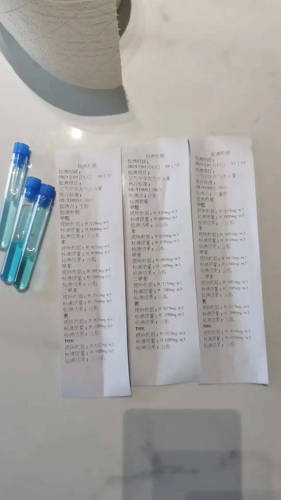 杜兰回忆,由于甲醛超标,工作人员便对全屋进行甲醛治理。今年2月18日,按照服务约定,陈强对她家进行了复检,检测数据显示,客厅、主卧、次卧的甲醛浓度分别为每立方米0.03毫克、每立方米0.042毫克、每立方米0.051毫克,检测结果均为“合格”。至此,她才安心在新房居住。