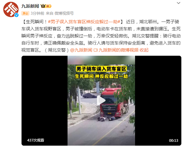 近日,湖北鄂州。一男子骑车误入货车视野盲区,男子被撞倒后,电动车卡在货车前,未直接遭到碾压。生死瞬间男子神反应,奋力逃脱躲过一劫,万幸仅受轻微伤。湖北交警提醒:骑行电动自行车时,请正确佩戴安全头盔。骑行人请与货车保持安全距离,避免进入货车的视觉盲区。(湖北交警)